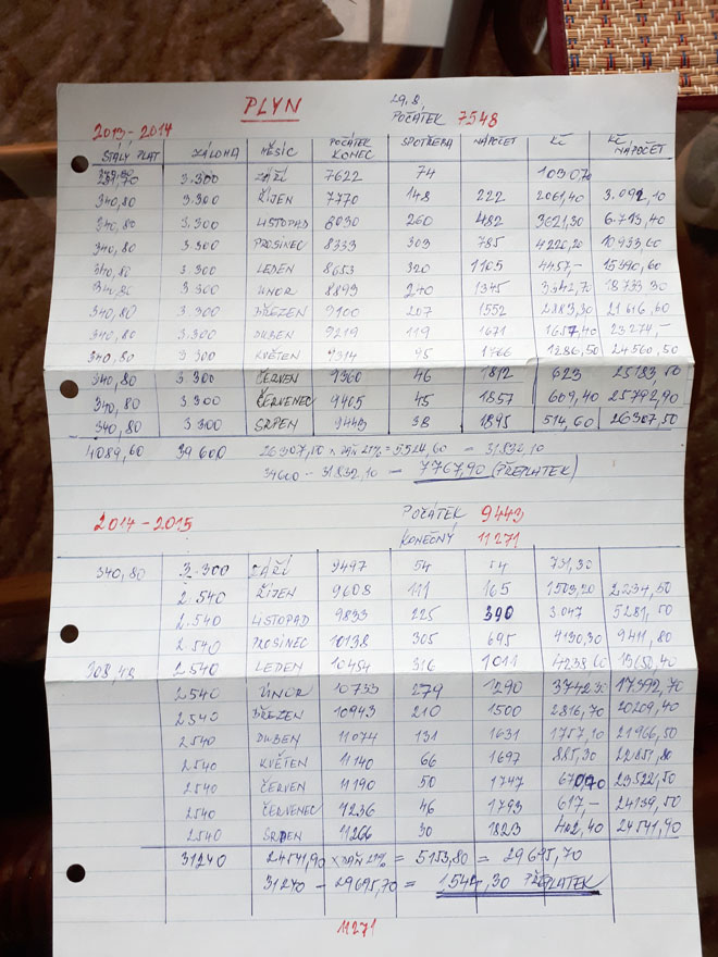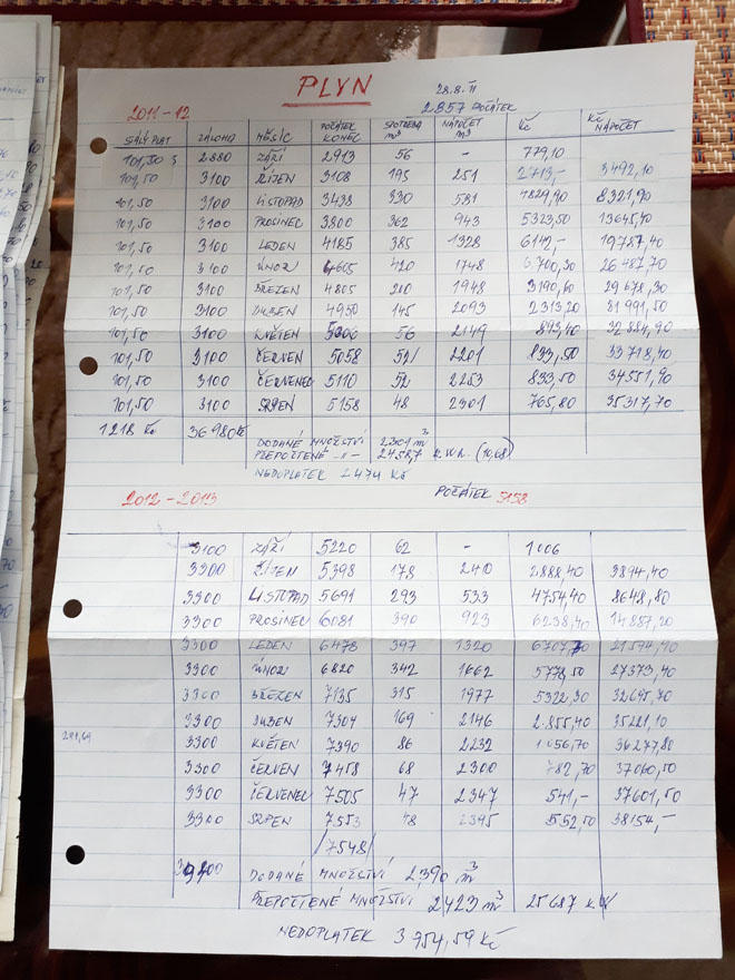 A jak už to tak bývá, když člověk začne platit poměrně dost peněz, začne se zajímat o spotřebu. A tak první, co ráno udělá je, že jde k plynoměru a zapíše aktuální stav. Takovouto evidenci si vede pan Zeman od roku 2001 a vzhledem k nárůstu cen energií, je to skutečně dramatické čtení.