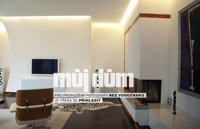 Ústředním bodem obývacího pokoje je krbová těleso s hladkou bílou omítkou. Do obývacího pokoje architekti navrhli nízkou sestavu se dvěma malými nástěnnými skříňkami z lakovaných MDF desek, i u ostatního vybavení převažují světlé barvy.Změny k lepšímu
