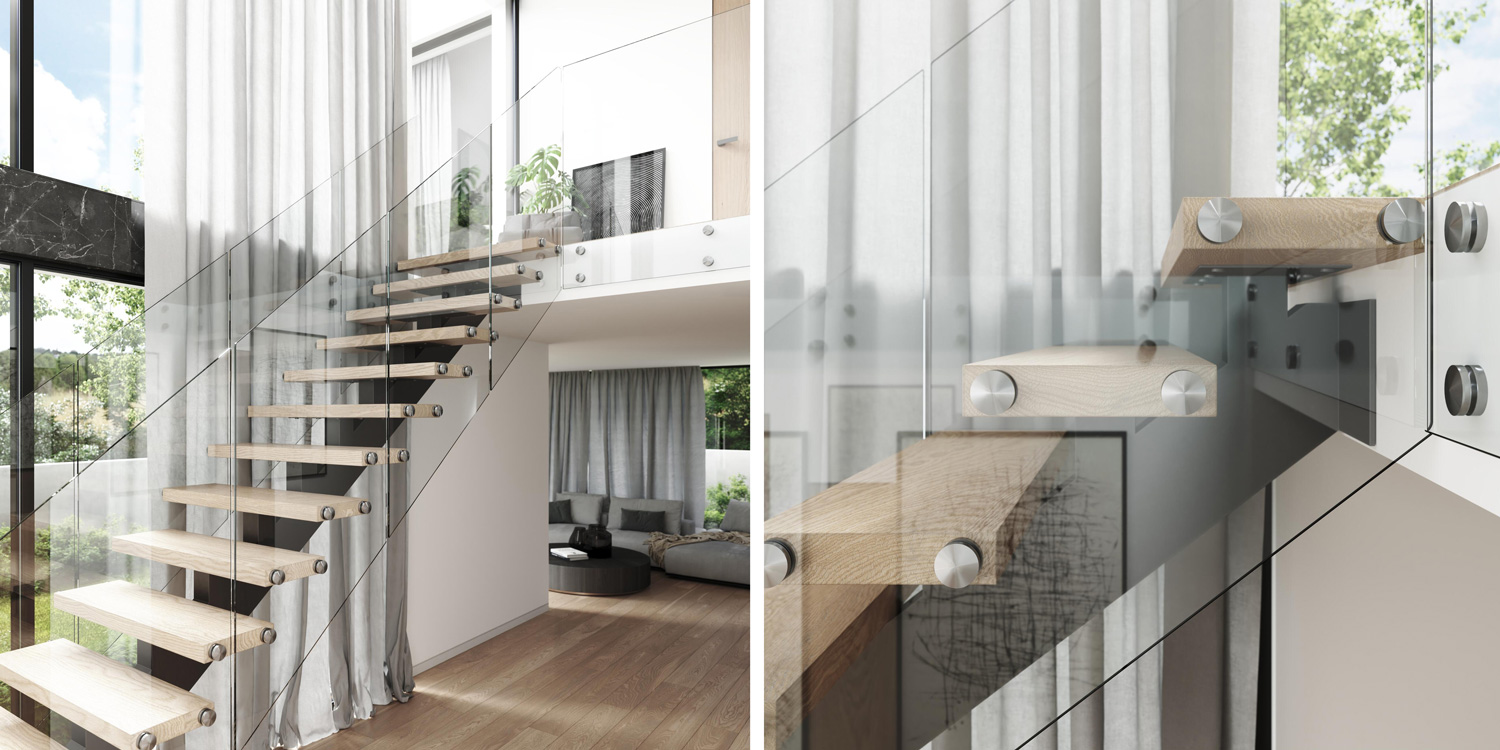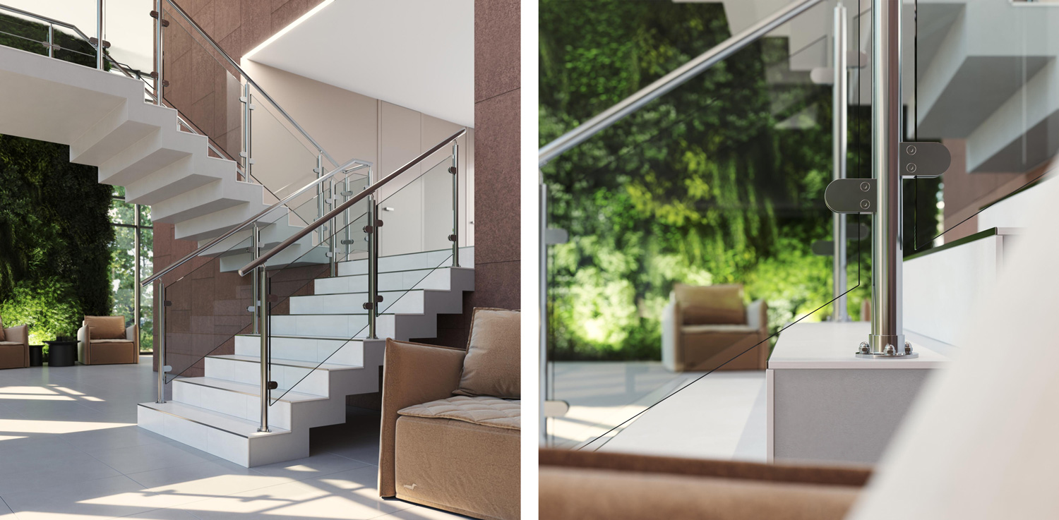 Zábradlí může mít různé materiálové provedení a jeho verze pro interiér a exteriér lze designově sjednotit. Vedle klasiky ve dřevě nebo kovu, je zajímavou volbou skleněná varianta zábradlí. U tohoto typu zábradlí tvoří základní konstrukci lepená kalená skla, která jsou buď vložena do úchytů mezi sloupky z nerezové oceli – model GENTLE, nebo se kotví z boku schodiště na tzv. nerezové puky – model TRANSPARENT. Skleněná zábradlí je vhodné doplnit o madlo v nerezovém nebo dřevěném provedení. Sloupky včetně úchytů, puky a madlo jsou vyráběny i v odstínech RAL dle požadavku zákazníka.