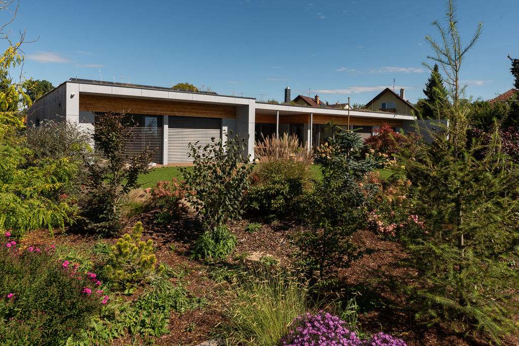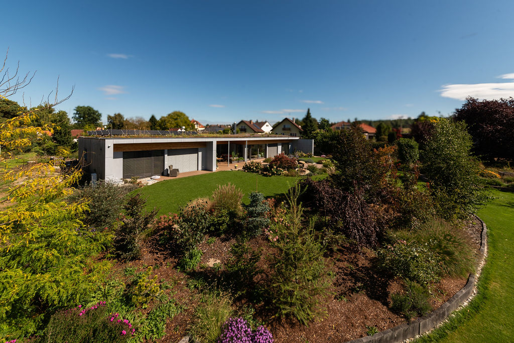 Majitel domu se živí zahradnickými službami, a tak není překvapením, že zahrada je skutečným klenotem celého projektu. V tomto případě kovářova kobyla rozhodně nechodí bosa– naopak, zahrada je ukázkou precizní práce, citlivého výběru rostlin a dokonalého sladění s architekturou domu.