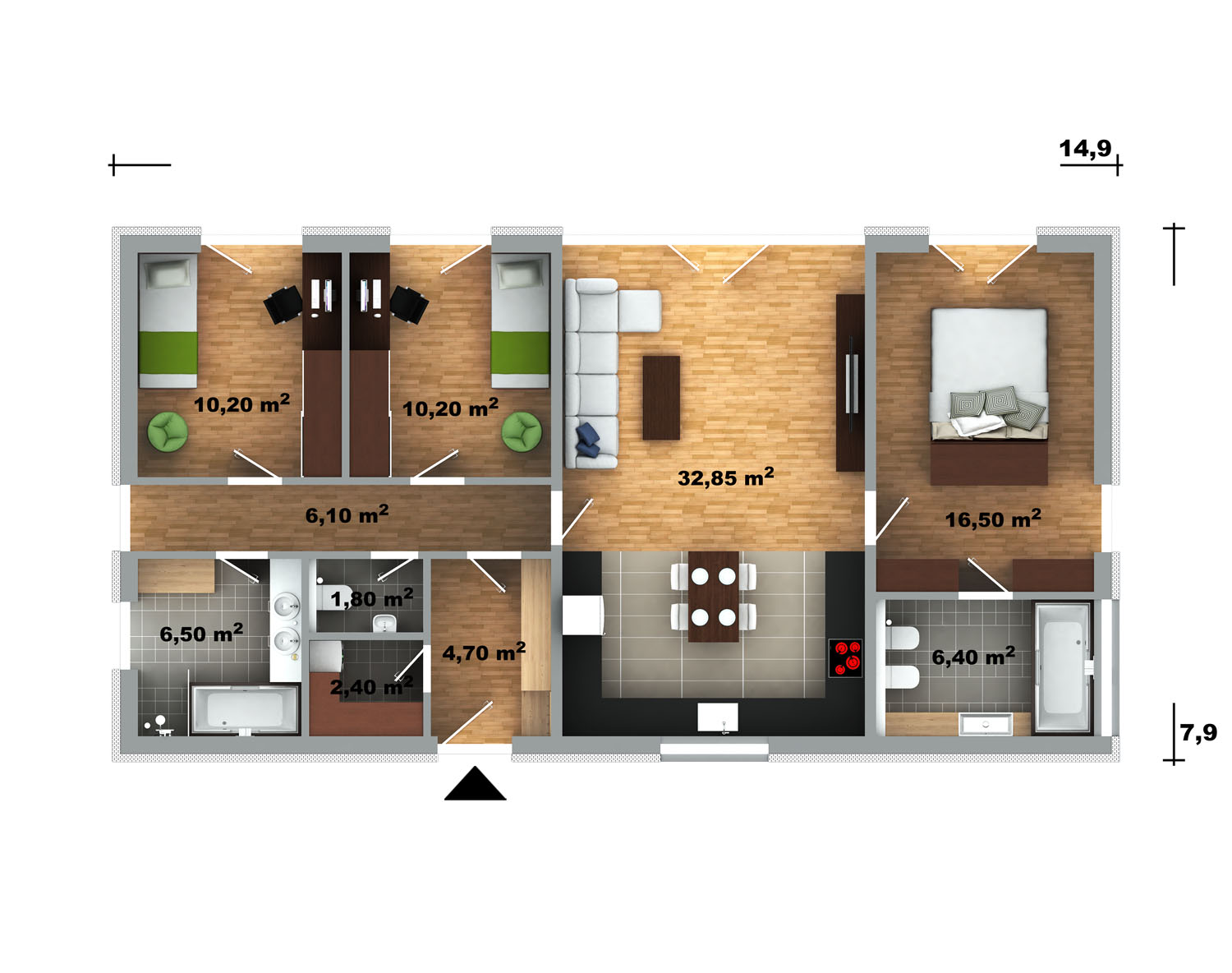 Rozměry: 14,9 × 7,9 m