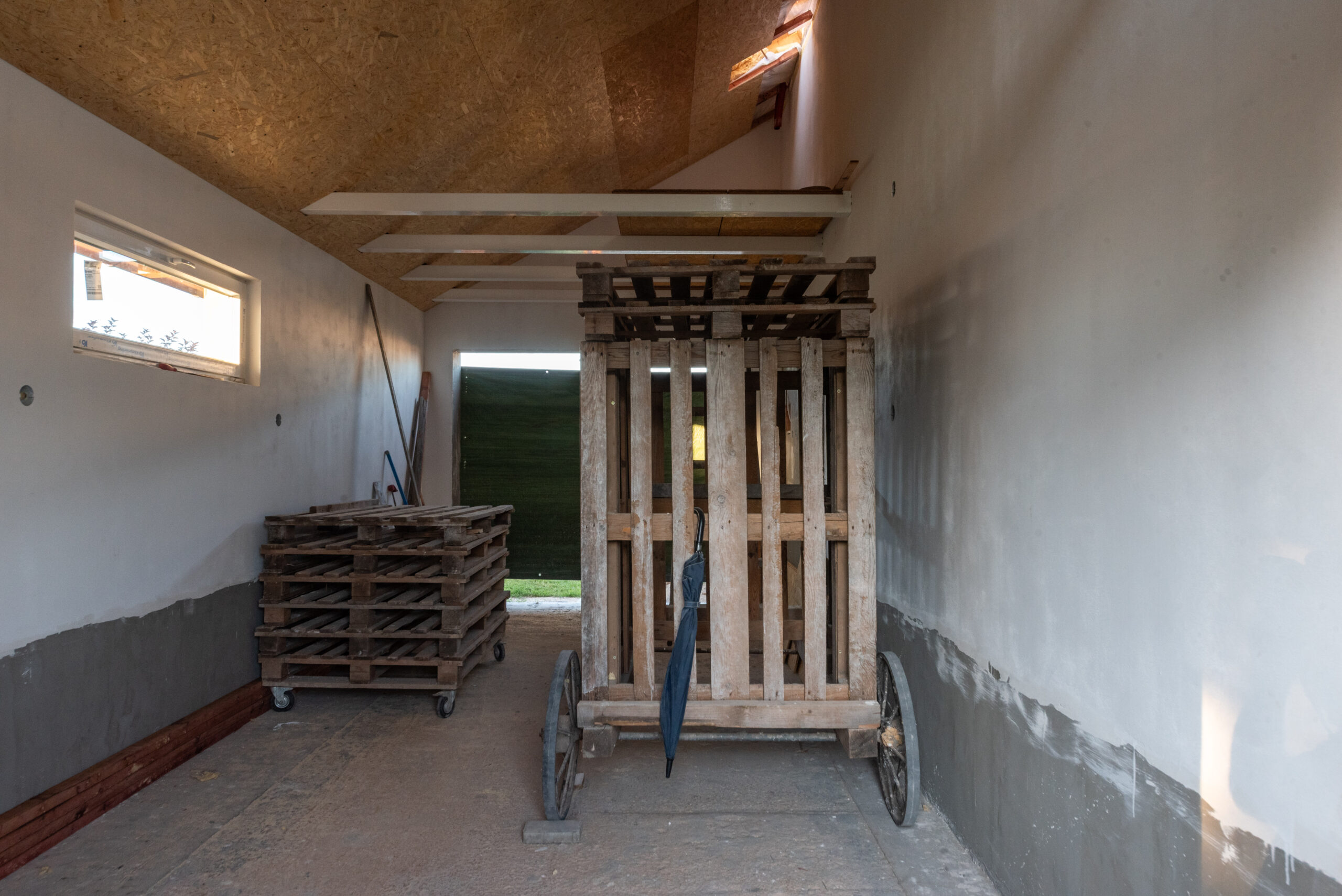 V její zadní části je umístěný zahradní domek, který funguje jako důležité zázemí a ve kterém se dá v případě potřeby přespat. Vladimír společně se svým tatínkem realizoval také bazén a nechybí ani venkovní sprcha s vtipně řešeným zakrytím – stačí chytit sprchový závěs, sklopit, udělat jednu otočku a soukromí je zajištěno. Jednoduché, ale chytré řešení, takové, jaká má pan majitel rád.
