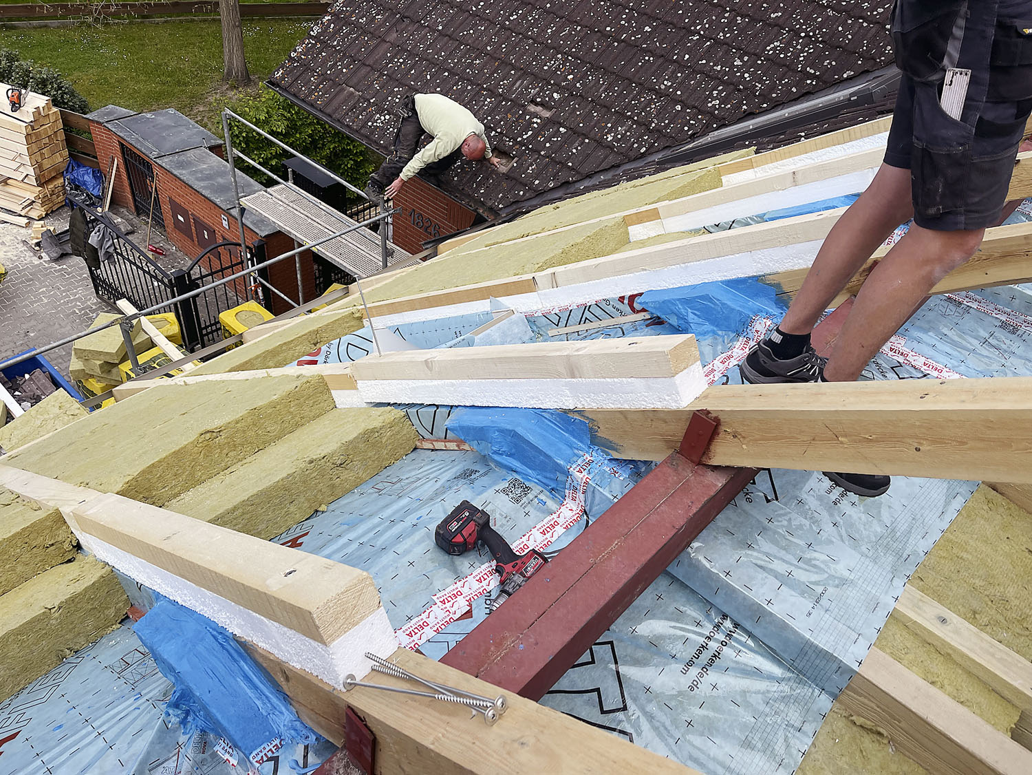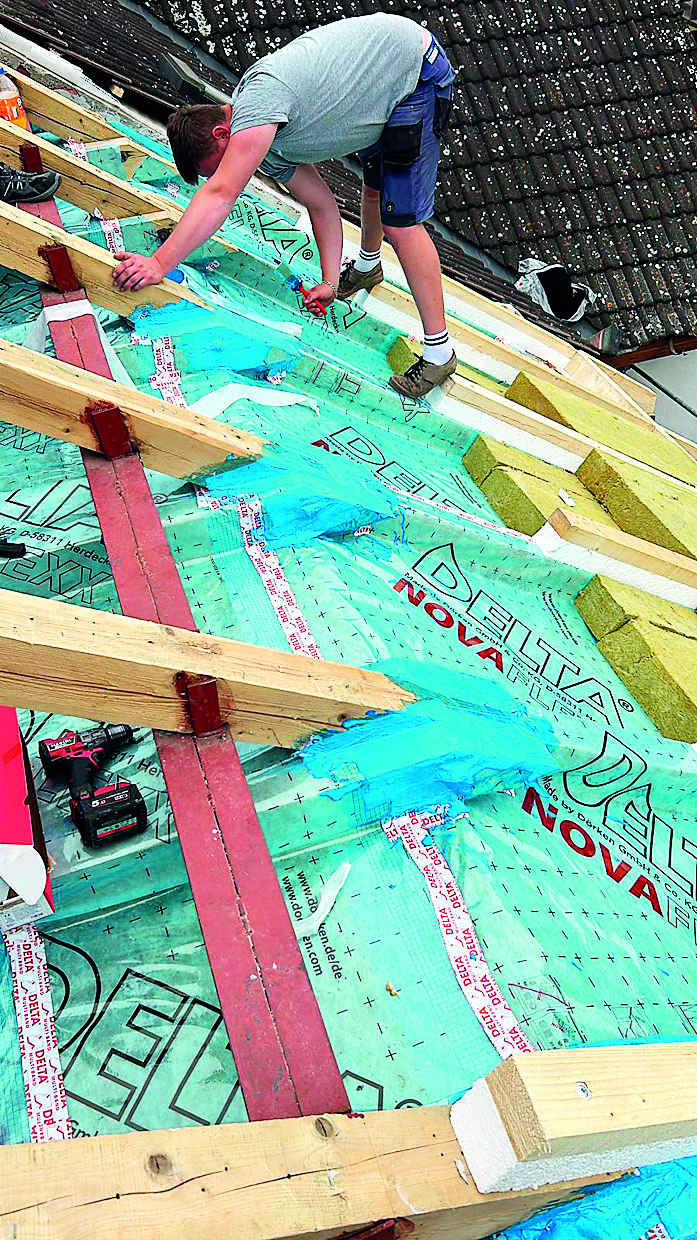K tomu je zapotřebí zkušený zhotovitel, který přesně ví, co a proč dělá. Po rozebrání a odstranění všech vrstev z vnější strany vloží do konstrukce sanační parobrzdu DELTA-NOVAFLEXX s proměnným difuzním odporem a veškerá její napojení a napojení na stavební konstrukce a konstrukční prostupy provede vzduchotěsně. K tomu slouží lepicí a těsnicí program DELTA, který je zaměřen na stoprocentní funkčnost v každém i sebekomplikovanějším detailu. Zároveň se lepicí a těsnicí program DELTA zaměřuje na maximální jednoduchost realizace a stoprocentní účinnost. Pracovat na střeše totiž není vůbec snadné, navíc musíme počítat s různorodostí materiálů, prachem, vlhkostí i změnami teplot. Proto je lepení od DÖRKENu pro takové náročné prostředí cíleně vyvíjeno.
